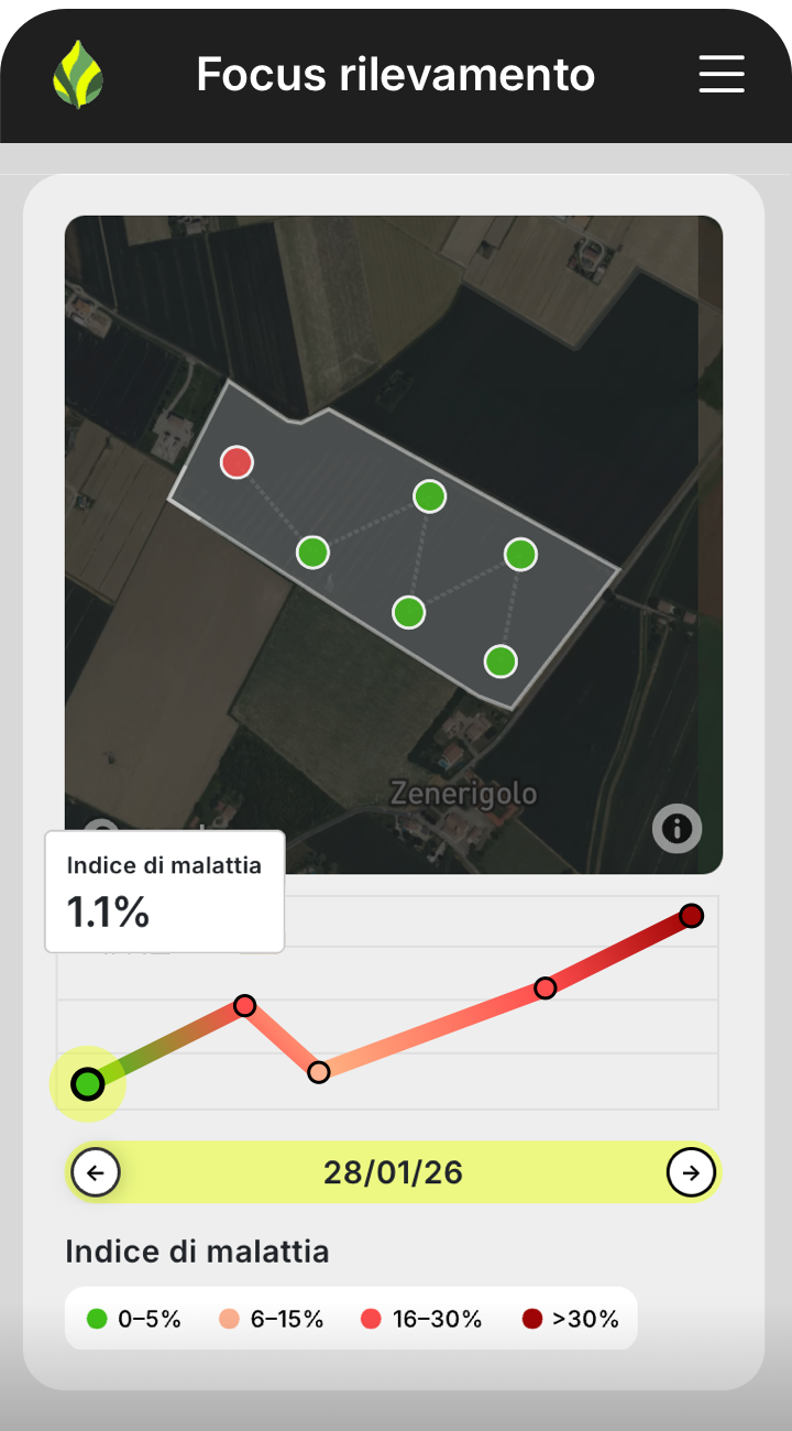 Puoi usarla subito, senza costi e senza vincoli. Inserisci i tuoi campi, osserva i dati, consulta le mappe di rischio e supporta le decisioni agronomiche con informazioni aggiornate e localizzate.