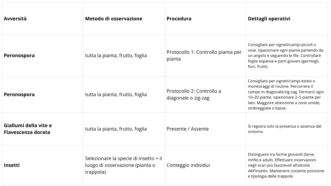 A ciascuna avversità sono associati un metodo di osservazione, una procedura operativa e istruzioni dettagliate da seguire: