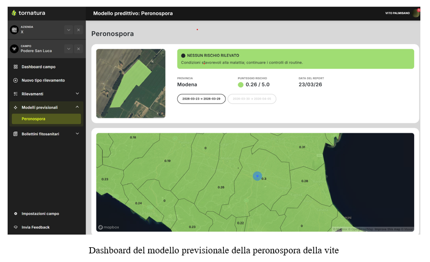 Tornatura offre un modello previsionale basato su Machine Learning che prevede il rischio settimanale di infezione da peronospora della vite per la provincia in cui si trova il campo monitorato.